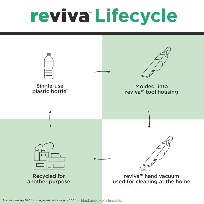 - kućište alata izrađeno od recikliranih materijala: za ekološki osviještenog potrošača, Kućište alata bežičnog ručnog usisavača Reviva dustbuster izrađeno je od tritanranovi 50% certificirani reciklirani materijal